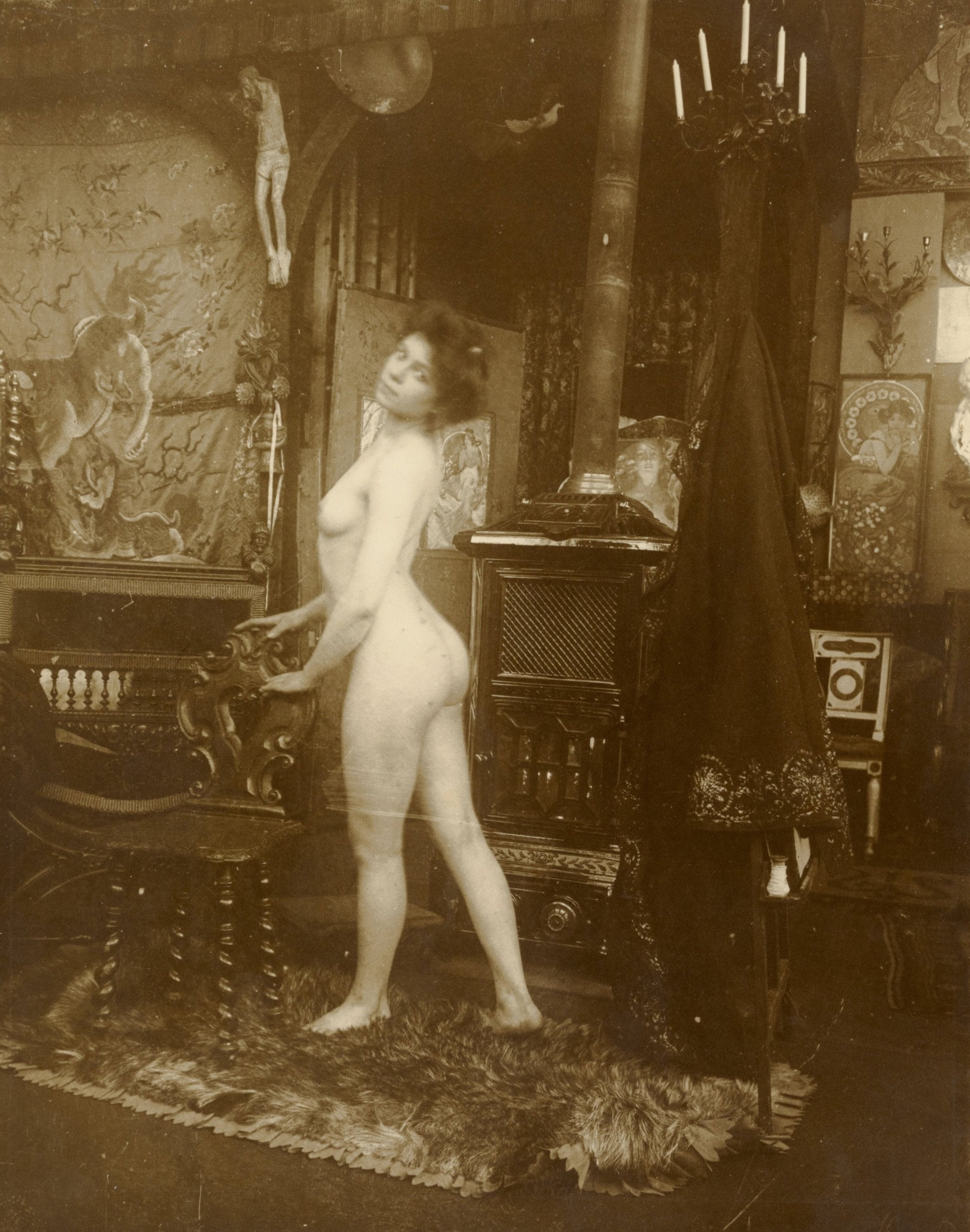 Modèle féminin nu avec une chaise ornée par Mucha (impression 6x8)